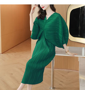 Design Sense Pleated Bat Sleeve V-neck Dress 2022 Summer New Plus Size Western Style Casual Loose Long Skirt