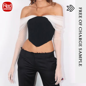 RedHK Custom High Quality New Arrives Black Pu With White Mesh Crop Blouse Women Tops And Blouses fishtail chiffon blouse