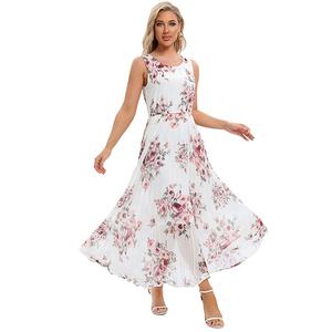 Women's Summer Elegant Crew Neck Sleeveless Dress Pink Floral Chiffon Printed Casual Long Pleated Chiffon Dresses