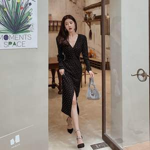 Wholesale 2022 Spring and Autumn New French Niche Waist Hepburn Style Retro V-neck Long Slit Slim Dress Temperament Dress