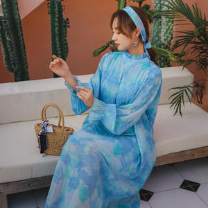 Wholesale 2022 Summer French Waist Gentle Dress Tie Dye Printed Sea Vacation Travel Retro Long Sleeve Blue Fairy Casual Dress