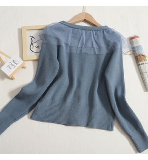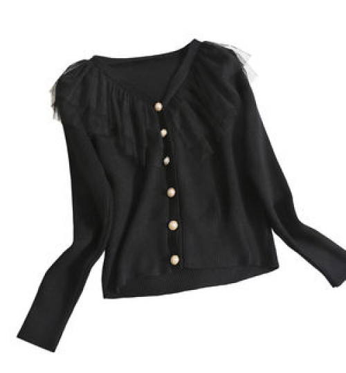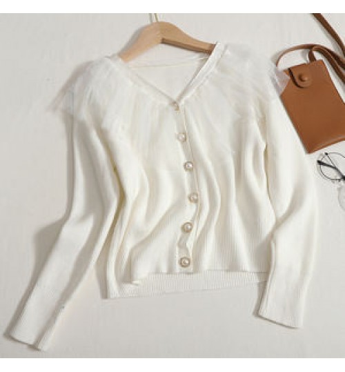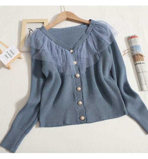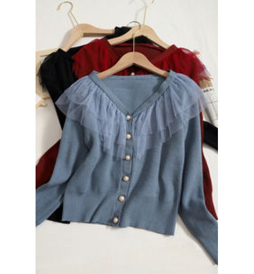 Wholesale Ruffled Mesh Stitching Knitted Sweater 2022 Autumn New Sweet V-neck Long-sleeved Slim Cardigan Women's Coat