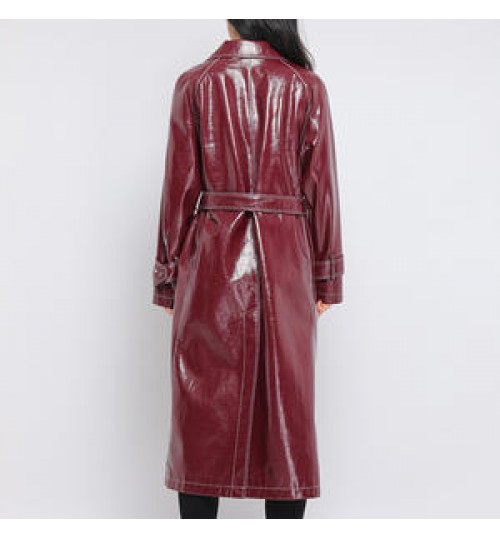 Wine red Trench Women's Slim Motorcycle Pu Leather Coat long slim with belt women's leather trench coats