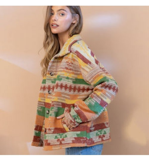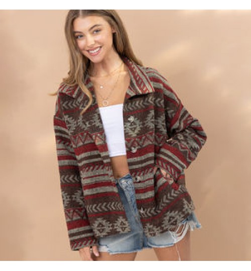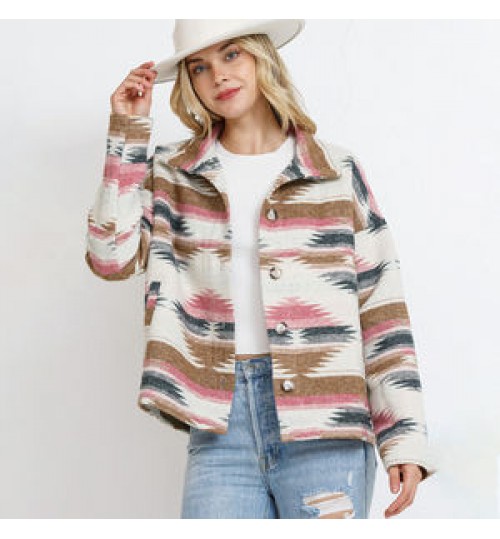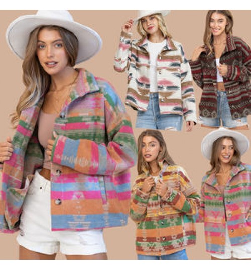 Western Vintage Women's Aztec Print Jacket Lapel Loose Long Sleeve Wool Coat Button Down Thick Jacket Shacket Women's Clothing