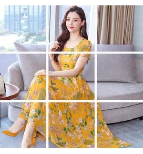 Custom Summer Dress Women's Short-sleeved Temperament Floral Round Neck Mid-length Floral Print Dress for Women Casual Dresses Loose
