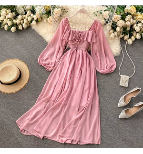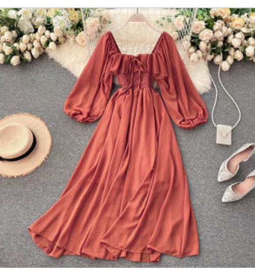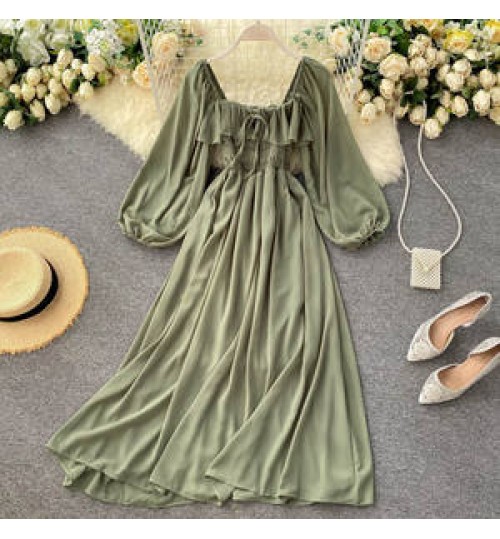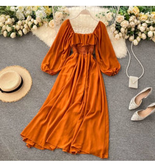 • Vestido Autumn Chic Long Sleeve Casual Dresses Women Lady Elegant French Retro Square Neck Puff Sleeve Chiffon Long Dress