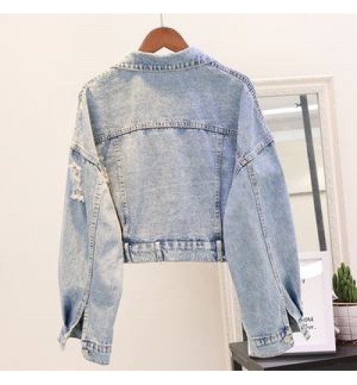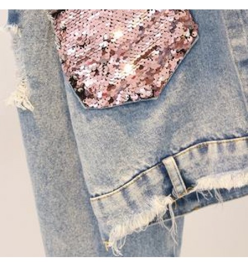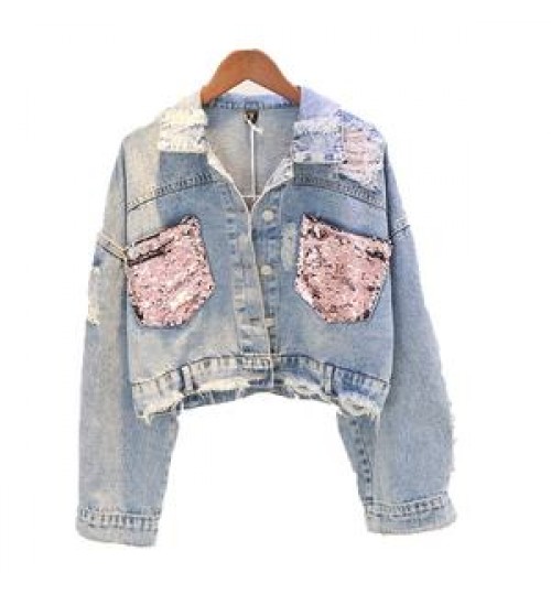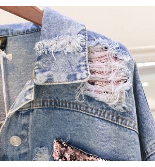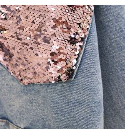 Custom Fashion Design Sequin Patches Denim Jacket Clothing Washed Sequin Denim Jacket Women Made In China