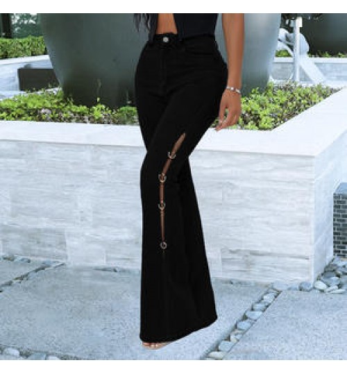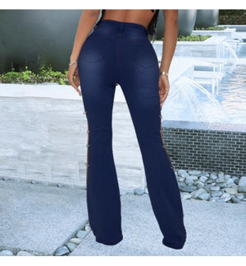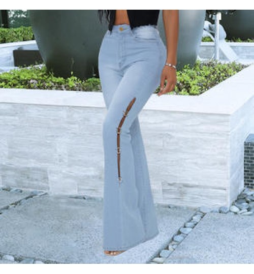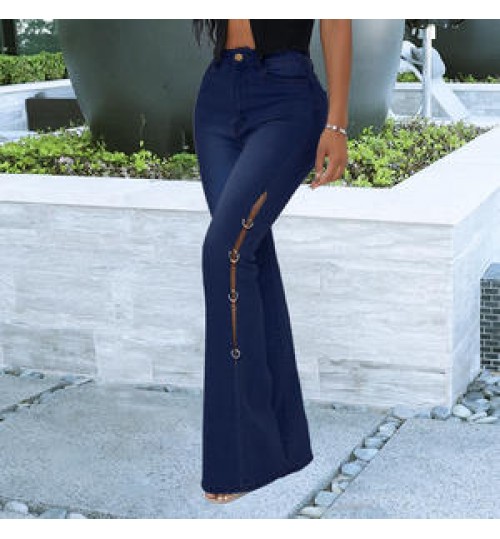 Hot Sell Side Chain Patchwork Denim Jeans Women Flared Trousers High Waist Stretch Slim Ripped Jeans Cargo Pants Street Wear
