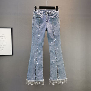 2021 Women's Spring Rhinestone Tassel Jeans Female New Elastic High Waist Slim Split Flare Denim Pants