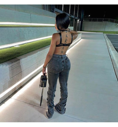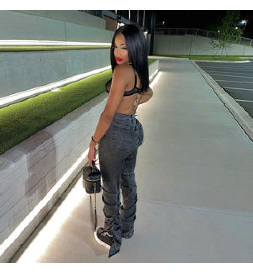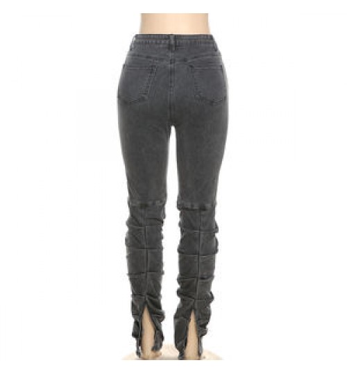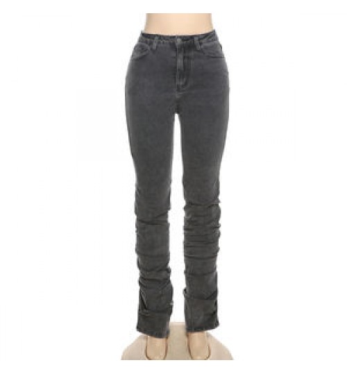 Kliou W21P04882 Newest Design Slim Cotton Jeans Women's Pants With Stacked Women's Trousers