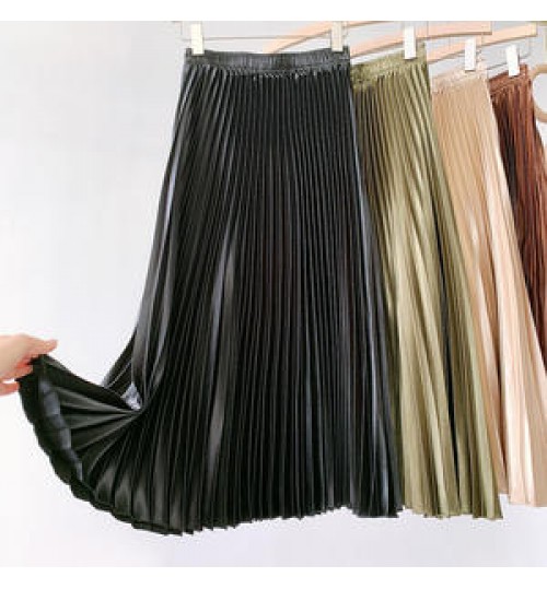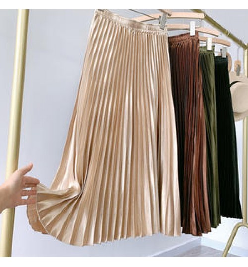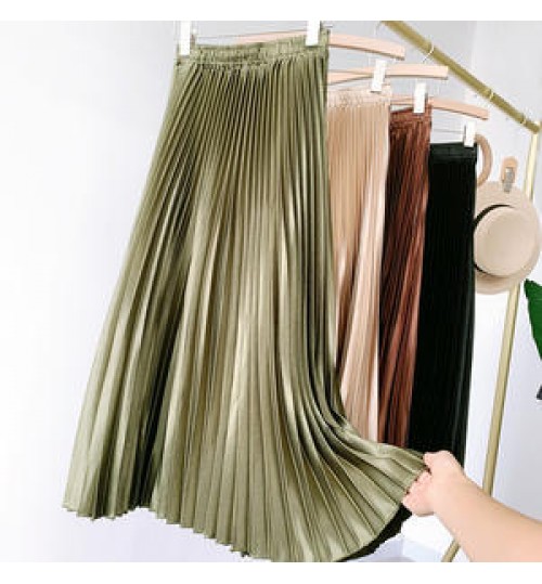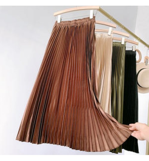 • Women's Vintage Pleated Midi Long Satin Skirt Korean Female High Waist Metal Color Black A-line Skirts Faldas