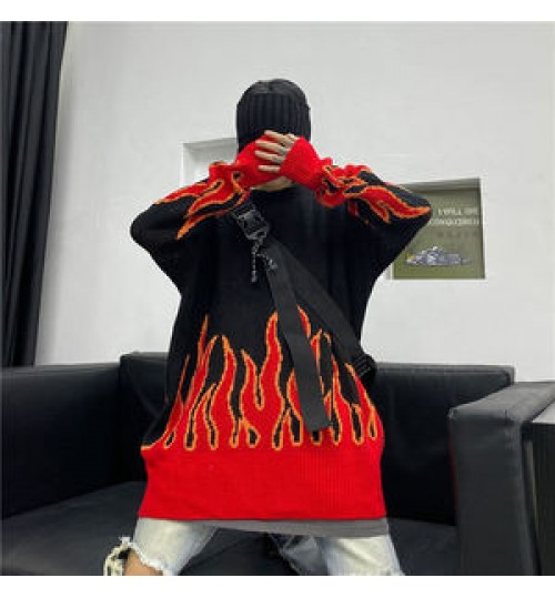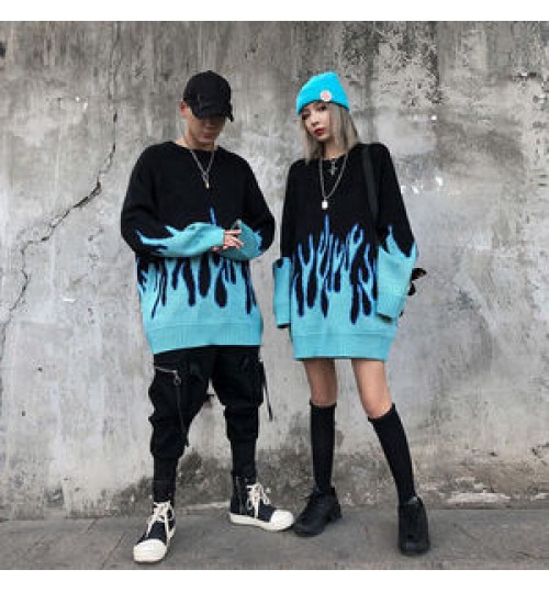 • Hip-hop Style New Trend Sweater Couple Pullover Knit Female Flame Jacquard Women's Sweater Top Loose Men's Sweater