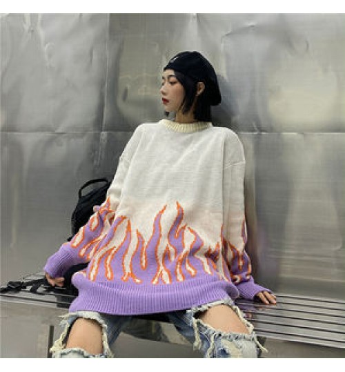 Hip-hop Style New Trend Sweater Couple Pullover Knit Female Flame Jacquard Women's Sweater Top Loose Men's Sweater