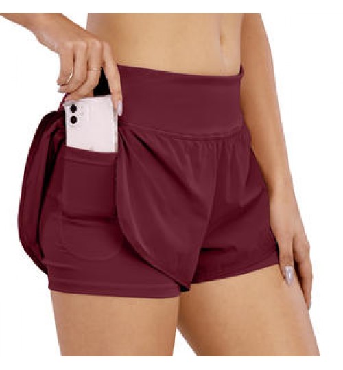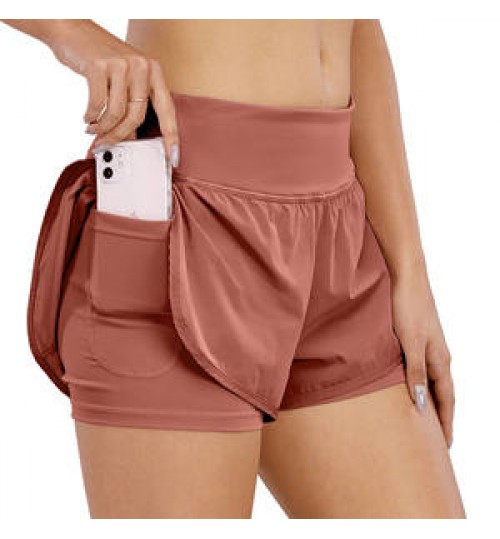 • Women's 2 in 1 Running Shorts Quick Dry Yoga Workout Athletic Gym Shorts with Phone Pockets