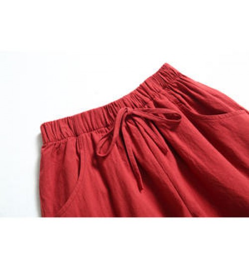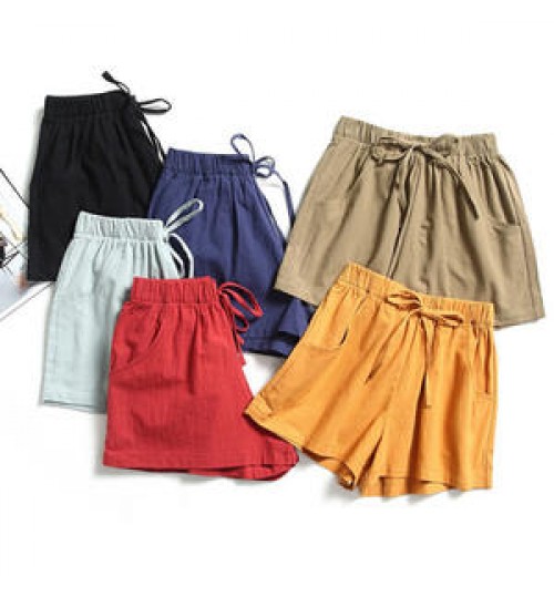 Woman Cotton Linen Fabric Shorts Drawstring Solid Summer Casual Beach Elastic Waist Pocketed Shorts Women 2021