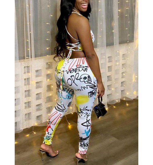 • LW Street Graffiti Print Backless White One-piece Jumpsuit