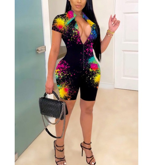 LW Street Splash Ink Print Zipper Design Black One-piece Romper