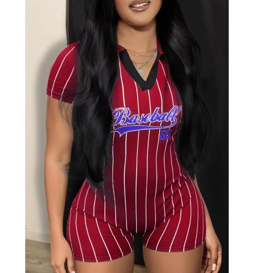LW V Neck Letter Print Striped Romper