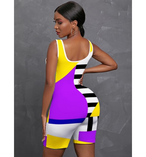LW Casual U Neck Color-lump Patchwork Yellow One Piece Romper