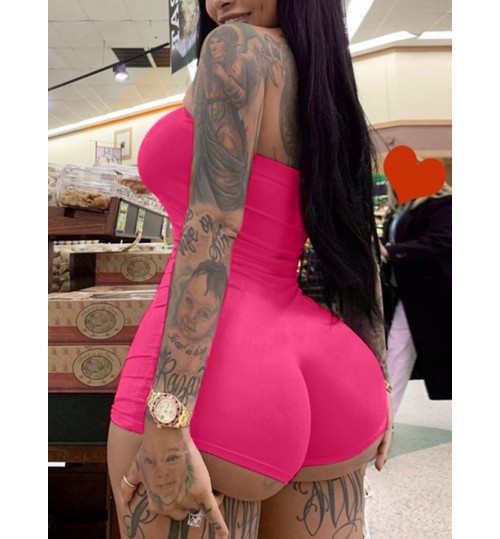 • LW BASICS Casual Off The Shoulder Skinny Rose Red One-piece Romper