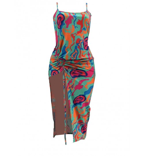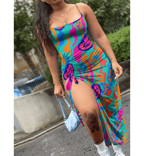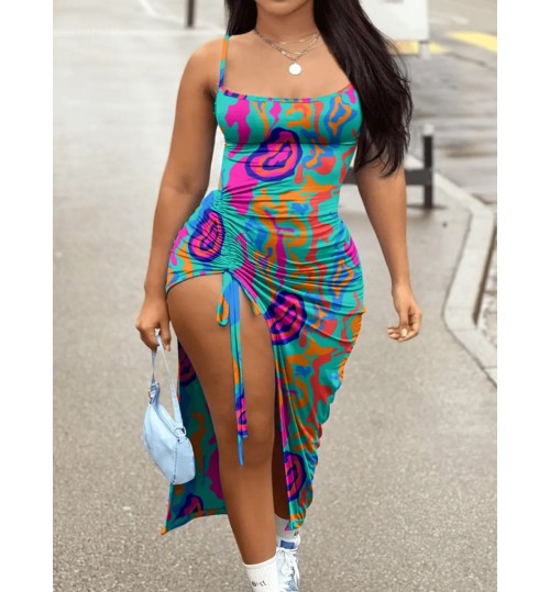 • LW Plus Size Mixed Print Drawstring Thigh Slit Bodycon Dress