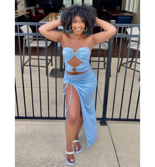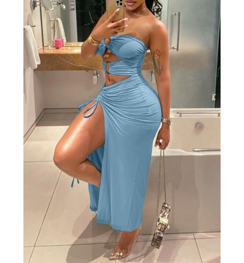 • LW Ring Decor Thigh Slit Ruched Dress