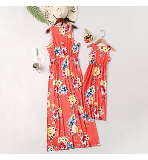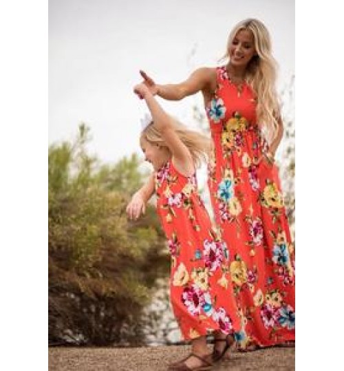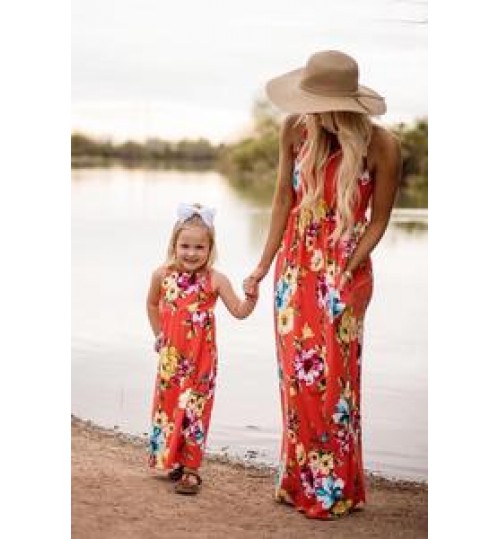 Wholesale Floral Sleeveless Crew Neck Long Mom and Baby Dress Mum and Daughter Family Matching Outfits