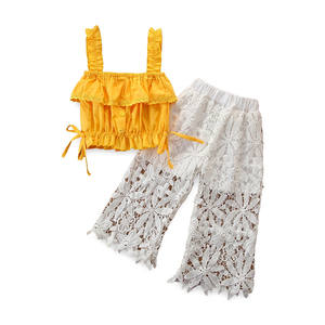 1~6 Years Old Summer Children's Clothing Girls Sweet Suit Yellow Sling T-shirt+Jacquard Lace Pants Two Piece Clothing Set