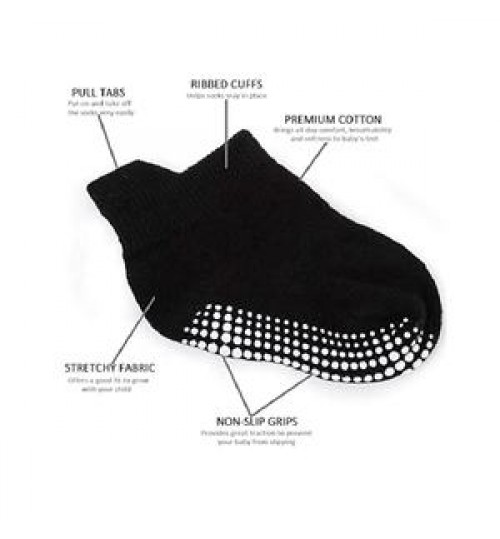 The pull tabs behind the ankle helps the mom to put on and take off the socks very easily, the elastic ribbed cuffs prevent the socks from falling off, the non-slip grippers on the base offers good protection at stopping slips for your baby