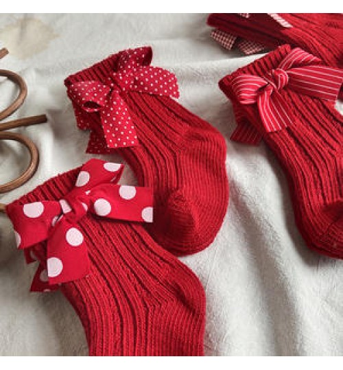 4201-2 Baby Girls Knee High Socks Kids Cotton Red Big Bow Christmas Sock Solid Warm Girl Toddler Soft Socks