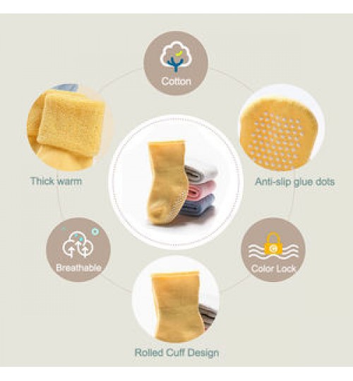 FEATURES | 82% Combed Cotton, 15% Polyester, 3% Spandex Machine Wash THICK COTTON SOCKS WITH TOWELING LINING: Made of high quality skin friendly Cotton, soft terry cover the entire sock, ultra soft and comfortable to wear, keep the little feet warm and cozy in cold weather Stretchy fiber not only make sure stay on well, but also allow fit as baby foot grows. They are strong elasticity and not too tight, you do not worry about leaving marks on the baby ’s chubby ankles and feet. Rolled cuff design: ANKLE or CREW socks, It depends on your needs and preferences. If unroll the cuff, they will keep your baby's calf warm and hard to slide off, they are usually mid-calf high, it depends on your baby's feet size. Large area anti-skid grippers can protect the baby safety, especially great for little kids who like running,scooting and jumping in the house. Also perfect for babies who learn to walk or crawl. |