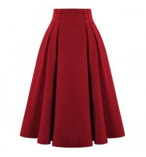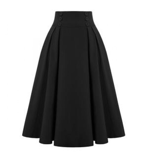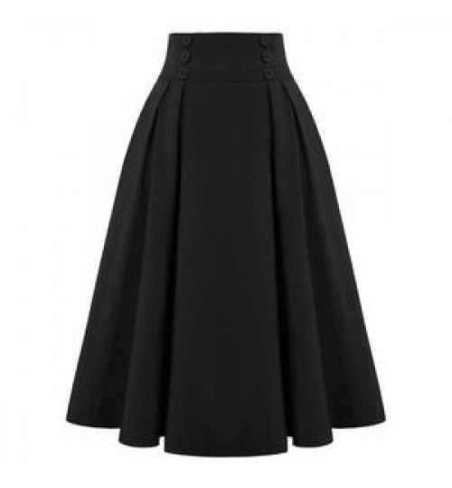 Summer Ladies Swing Buttons Decorated Elastic Skirts High Waist Elegant Retro Pleated Skirt