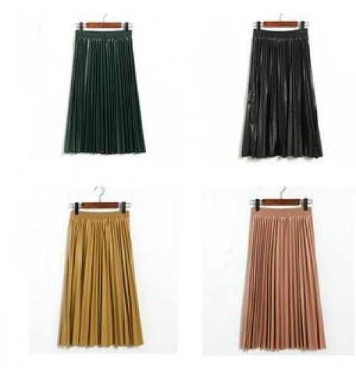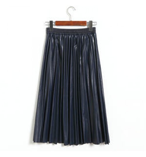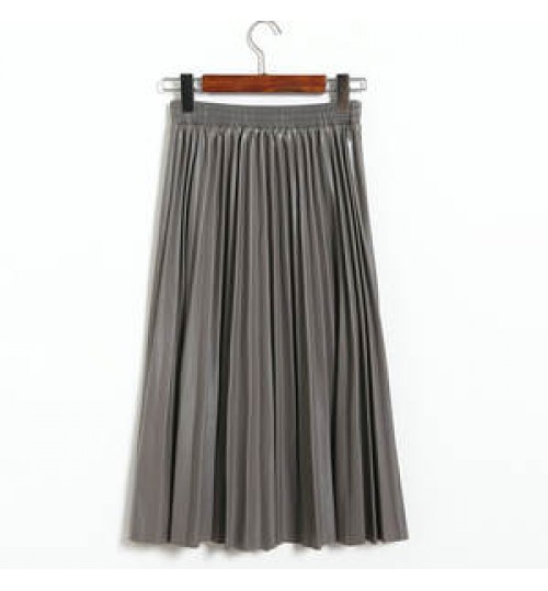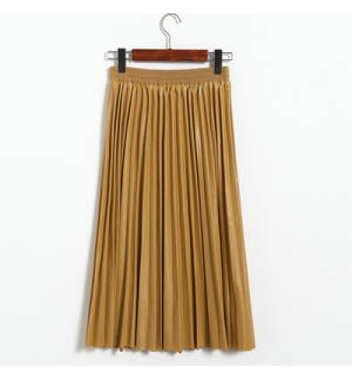 Autumn Winter Women Midi-Calf PU Leather Elastic Waist Pleated Skirts Office Ladies High Waist A-Line Harajuku Midi Skirts