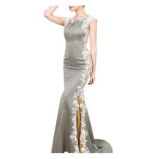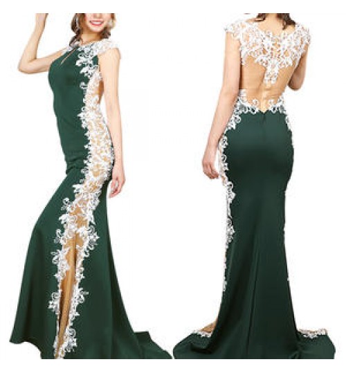 Dark green tailed skirt. Gorgeous, high-end, sexy evening dress, the collar and back of the perspective network stick car lace flowers, all show lovely, gorgeous and sexy. The two sides of the perspective network splicing clip car lace highlights the luxury, mystery and sexy of the dress.