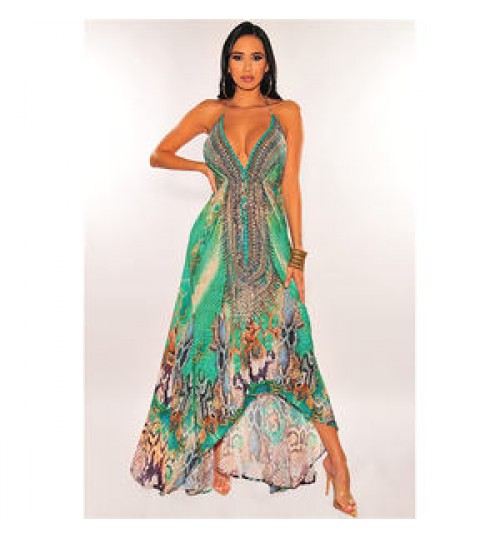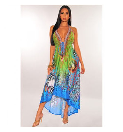 Summer foreign trade women's Vintage V-neck sexy backless skirt printed suspender dress