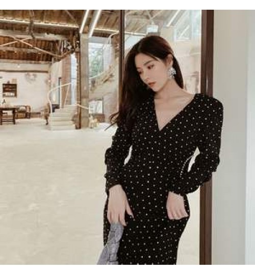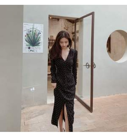 Wholesale 2022 Spring and Autumn New French Niche Waist Hepburn Style Retro V-neck Long Slit Slim Dress Temperament Dress