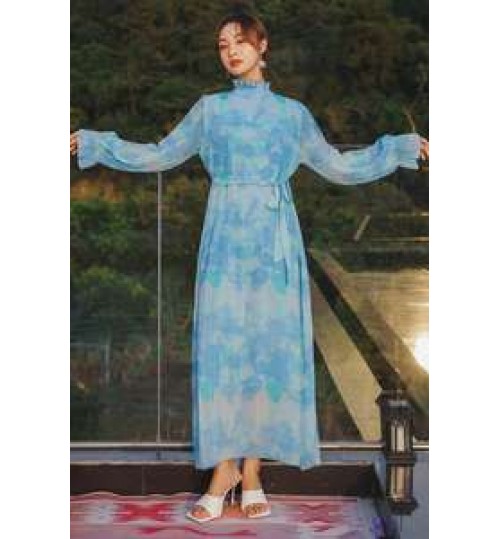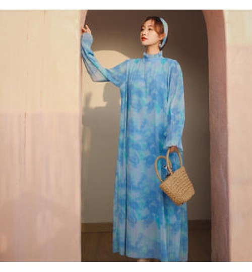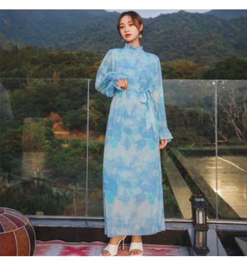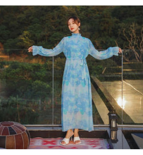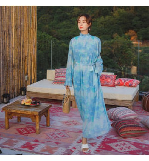 Wholesale 2022 Summer French Waist Gentle Dress Tie Dye Printed Sea Vacation Travel Retro Long Sleeve Blue Fairy Casual Dress