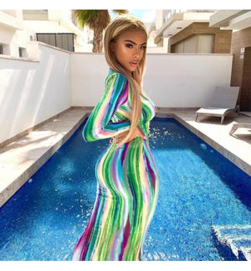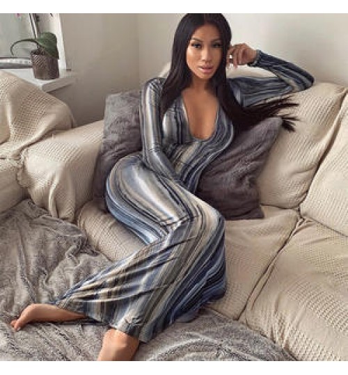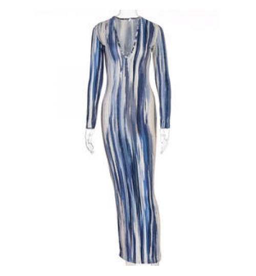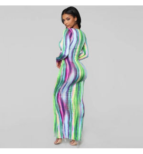 Full Sleeve Printed striped tie-dyed Color Long Dress Deep V Neck elegant Party Dress