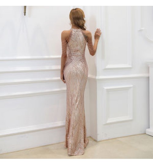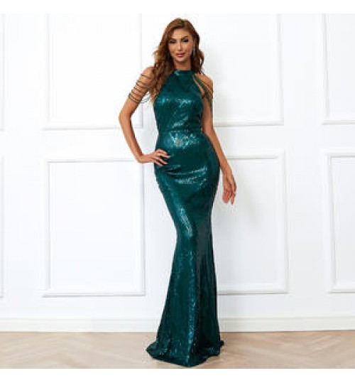 • 2022 Sleeveless Halter Gold Sequins Gowns Mermaid Tassel Bride Wedding Evening Dress Evening / Formal Dresses Party