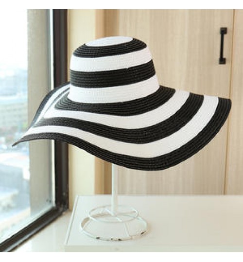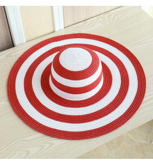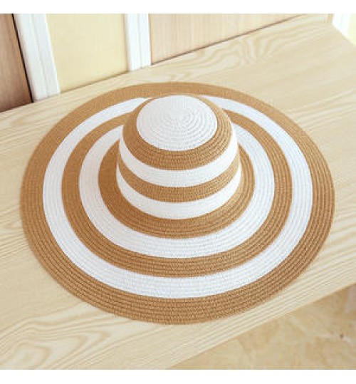 Women Natural Straw Striped Hat Derby Beach Sun Hat Lady Summer Wide Brim UV Protect