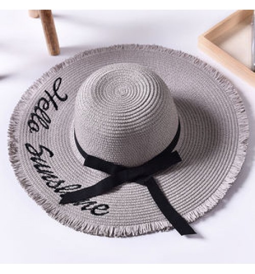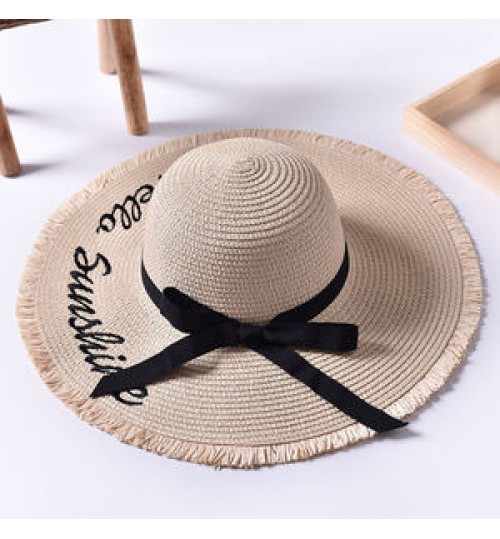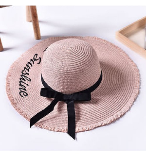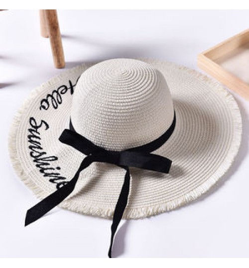 Wide Brim Sun Hats For Women Letter Embroidery Black Bow Panama Straw Hat Folded Floppy Beach Ladies Caps