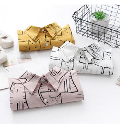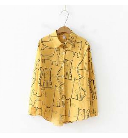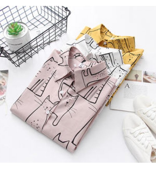 Women Hongkong Korean Fashionable Style Cartoon Cute Cats Printing Long-sleeve White Shirts Casual Office Blouse T06112T 1