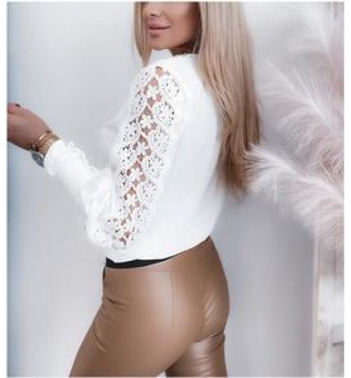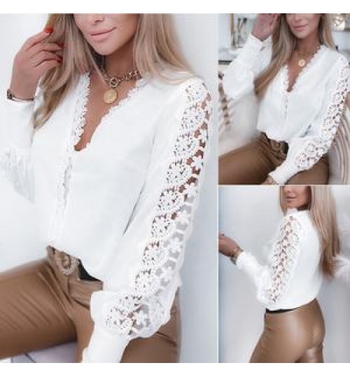 Elegant ladies White Cut Out Tops Shirt V Neck Women Solid Contrast Lace Blouse