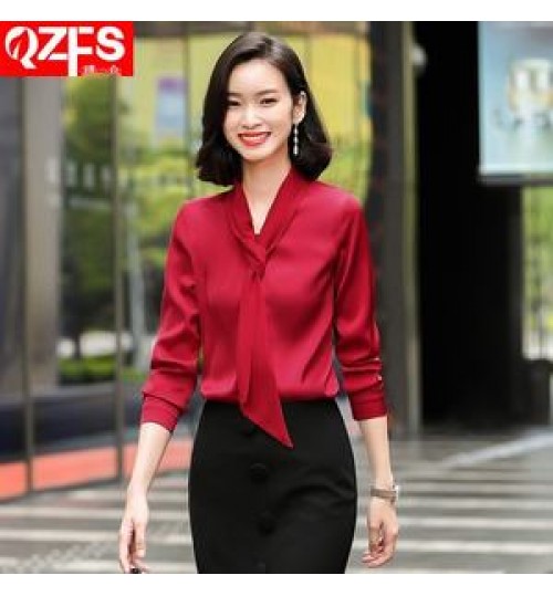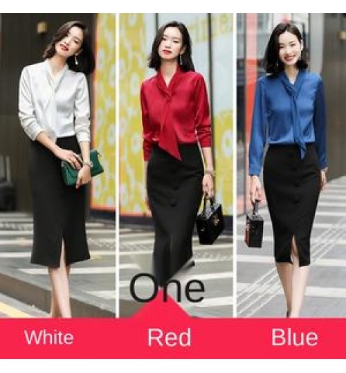 Chiffon Shirt Fashion V-neck Top White Blue Shirt Women's Long-sleeved Work Clothes Korean Blouse Women's Spring and Autumn Bow