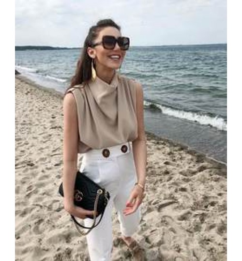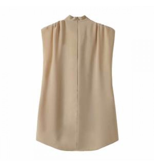 • 2022 Summer Elegant Solid Color Soft Shirts Blusa Elegante Sleeveless Mock Neck Blouse Woman ChiffonTops And Blouses
