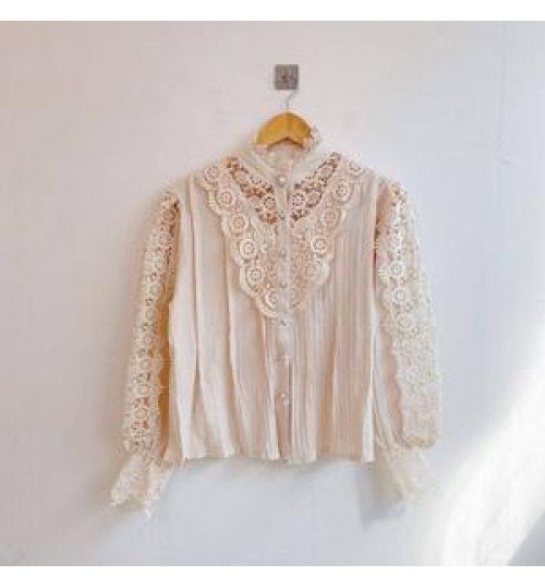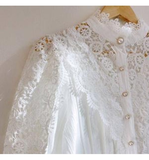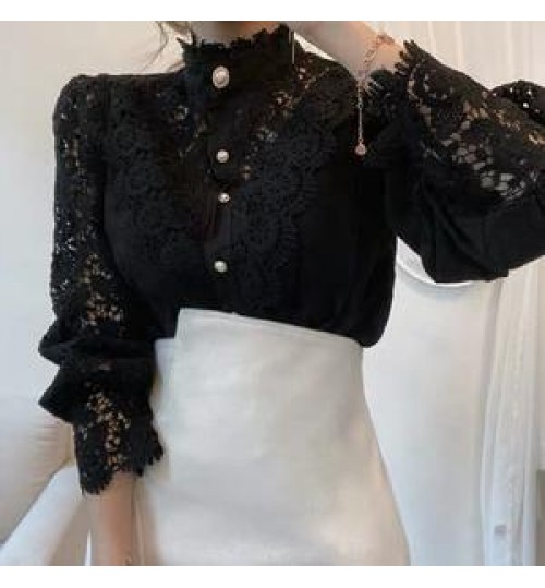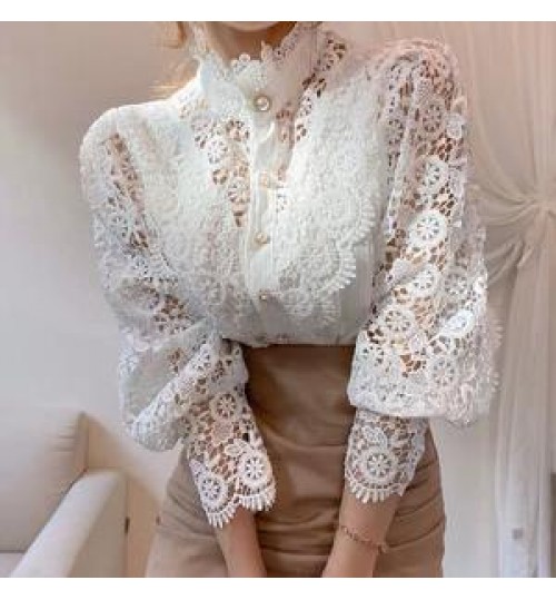 Trending Hollow Out Women's Elegant Lace Tops Blouses With Long Sleeve Pearl Button