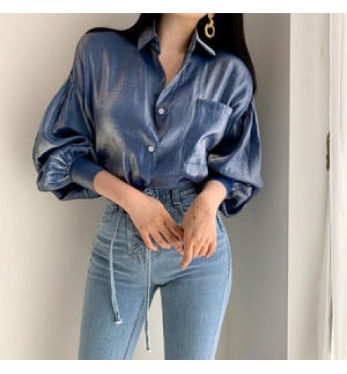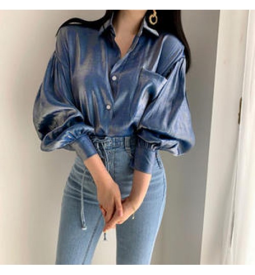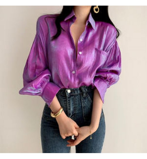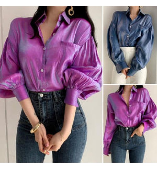 Women Reflective Bright Gradient Color Shirts Vintage Female Elegant Lapel Button Blouse Casual Puff Sleeve Tops