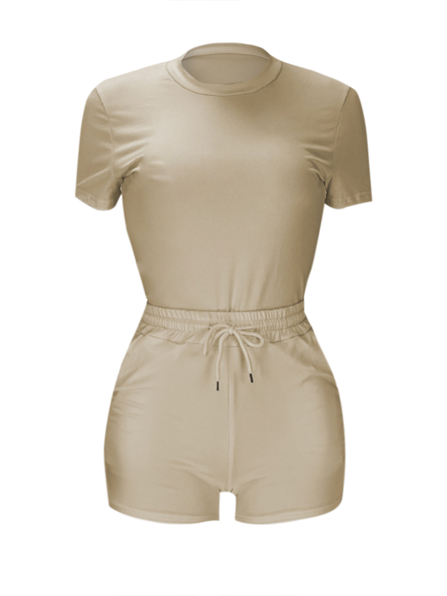 LW BASICS Plus Size Round Neck Drawstring Shorts Set