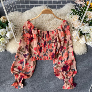 TW863A 2020 Hot trend Fashion Puff Sleeve Flower Print Crop Top Chiffon Blouse Short Shirt Women Blouse
